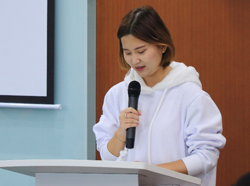 曾获得京东“双十一”排行榜9次日标兵称号的刘佳同学发言与大家分享自己在京东总部职场化教学与体验的感受与经验。她说职场体验让自己学会了思考问题,抓住问题关键所在,然后顺利解决问题。她说自己的成绩与学院辅导员老师的耐心指导、京东主管师傅的精心培养,还有自己的努力是分不开的。她代表学院学子再次感谢京东给予的职场实践机会,感谢各位京东主管老师的谆谆教诲与指导。
