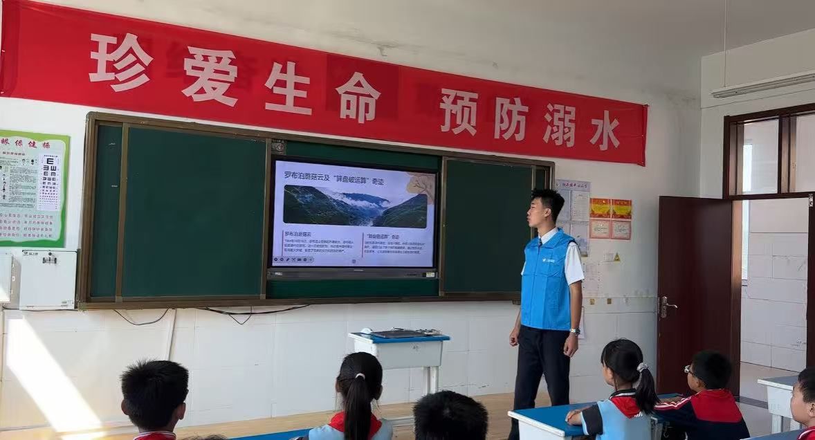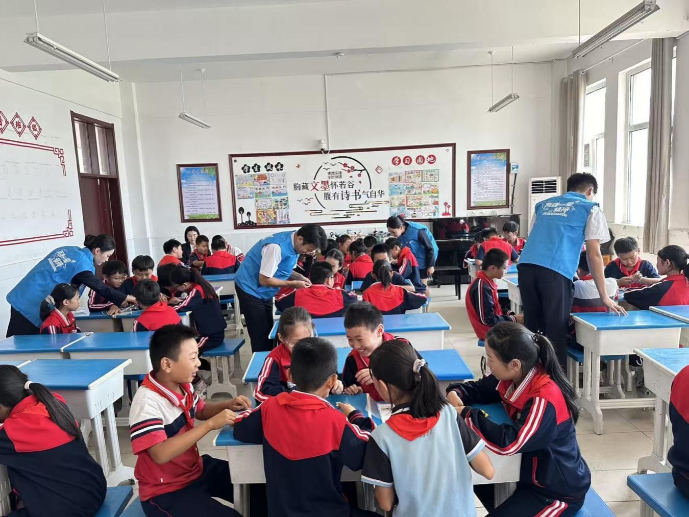 揭牌仪式后,山东海事职业学院航空学院“红色印迹”宣讲团走进班级,开展以“两弹一星”精神为主题的宣讲活动。宣讲员通过生动讲述和影像资料,为孩子们介绍了钱学森、邓稼先等科学家无私奉献的感人事迹。同学们凝神聆听,眼中充满崇敬。互动环节中,“热爱祖国、无私奉献,自力更生、艰苦奋斗,大力协同、勇于登攀”的“两弹一星”精神深深植根于孩子们心中。