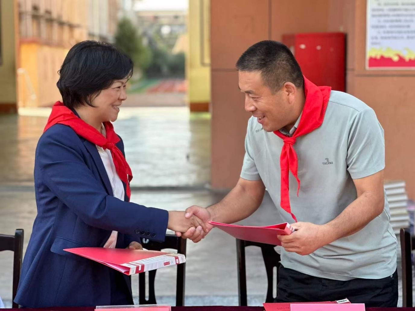 山东海事职业学院还向铜井镇中心小学捐赠了科普、文学、红色经典等各类图书及书包等学习用品。团委书记刁宁表示:“愿这些‘精神食粮’陪伴孩子们探索世界、滋养心灵。”少先队员们欣喜接过图书,校园内洋溢着温暖与希望。