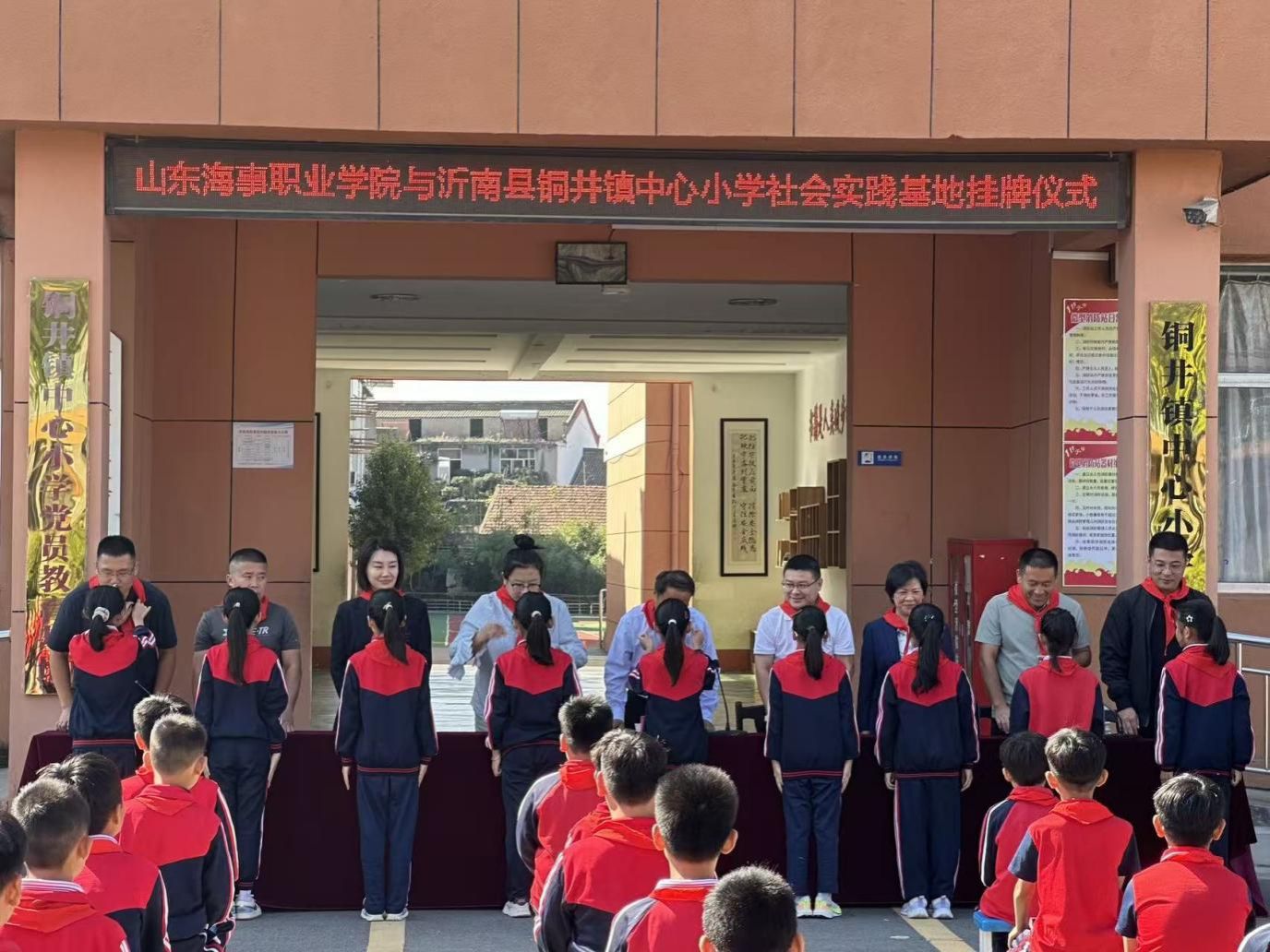 为深化校地教育协同,搭建知识与实践融合的育人平台,充分发挥高校服务地方基础教育的职能,9月25日上午,山东海事职业学院与沂南县铜井镇中心小学社会实践基地揭牌暨共建签约仪式在铜井镇中心小学成功举行。山东海事职业学院党委委员、副校长宋志刚,团委书记刁宁,航空学院党支部副书记田兴红,铜井镇中心小学党支部书记、校长刘光增,党支部副书记姚立志等出席仪式。