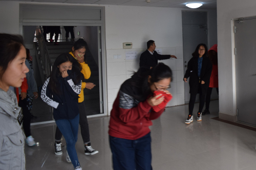 培训讲座结束后,随着警报铃声响起,消防疏散演练拉开序幕。演练场景假设为地震后宿舍楼发生火灾,在这种情况下,全体学生在领导老师们的指导下,用手或手绢捂嘴,小步快走,有条不紊的撤离“火灾现场”迅速来到宿舍楼前安全地带,不到三分钟,全校师生全部撤离教学楼,本次演练没有遗漏一名学生,没有发生拥挤踩踏事故、达到了安全、迅速的演练目的。院领导仉继航统一指挥了这次疏散演练,演练活动后,还做了总结发言,强调消防安全重于泰山,是我院工作的重中之重,希望师生们认识到消防安全工作重要性,提高安全意识和自防自救能力。