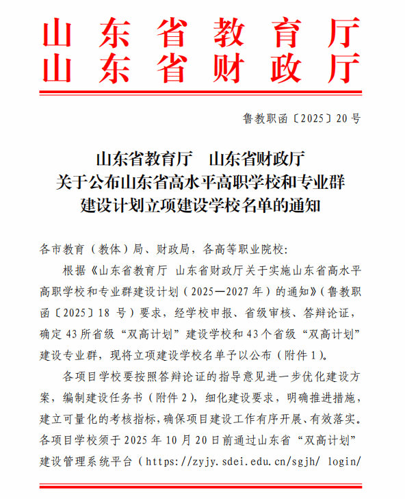 近日,山东省教育厅、山东省财政厅联合发布《关于公布山东省高水平高职学校和专业群建设计划立项建设学校名单的通知》(鲁教职函〔2025〕20号),学校海洋工程装备技术专业群成功入选省级“双高计划”建设专业群。