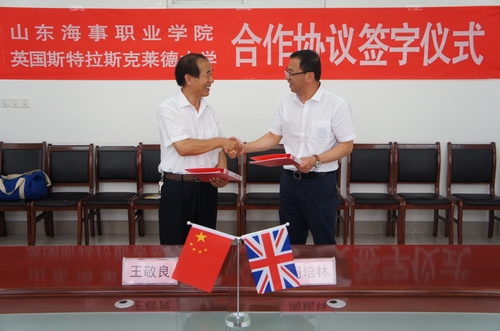签字仪式上,王敬良院长发表讲话,对周教授及英方学生第二次来访学院表示热烈欢迎,王院长表示,双方开展合作办学将进一步促进双方师生的学习交流,有利于相互促进共同提高,祝愿双方合作办学顺利开展。根据协议双方将联合开展本科、硕士研究生的培养,学生顺利完成在山东海事职业学院三年专科学习并获得毕业证书,可以申请到英国斯大攻读本科三、四年级课程。完成课程的学生将被授予斯特克莱德大学本科学士学位,并可继续申请读硕士研究生课程。