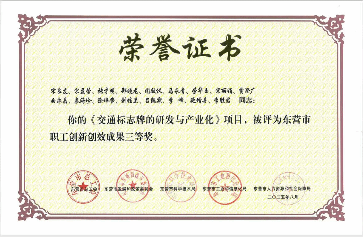 近日,由东营市总工会、市发展和改革委员会、市科学技术局、市工业和信息化局、市人力资源和社会保障局联合组织的东营市职工创新创效成果评选结果正式揭晓。我校教师马永青、郑晓龙作为核心成员参与的《交通标志牌的研发与产业化》项目,荣获“东营市职工创新创效成果三等奖”。