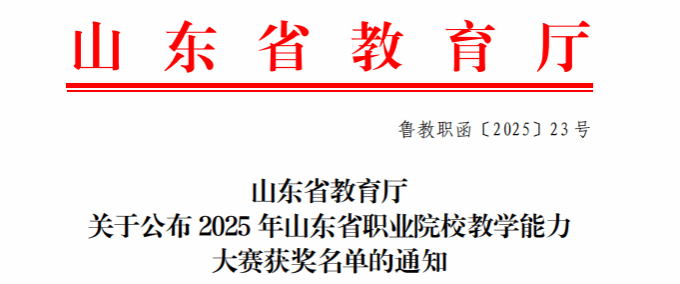 近日,山东省教育厅公布了2025年山东省职业院校教学能力大赛获奖名单,学校参赛教师团队凭借扎实的专业功底、创新的教学设计与精湛的教学技艺脱颖而出,在高职组多个组别中获得二等奖1项,三等奖2项。