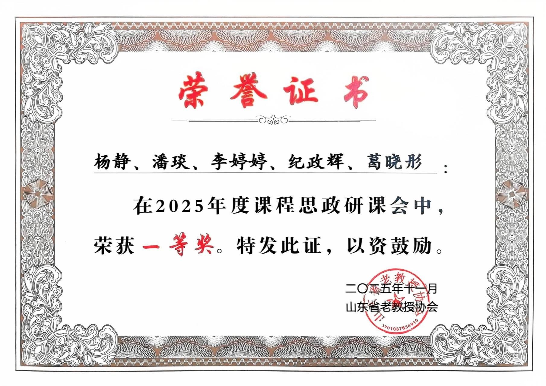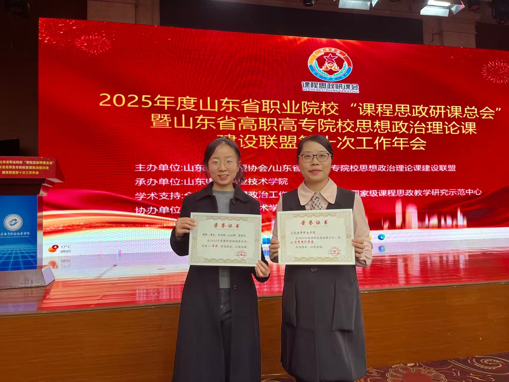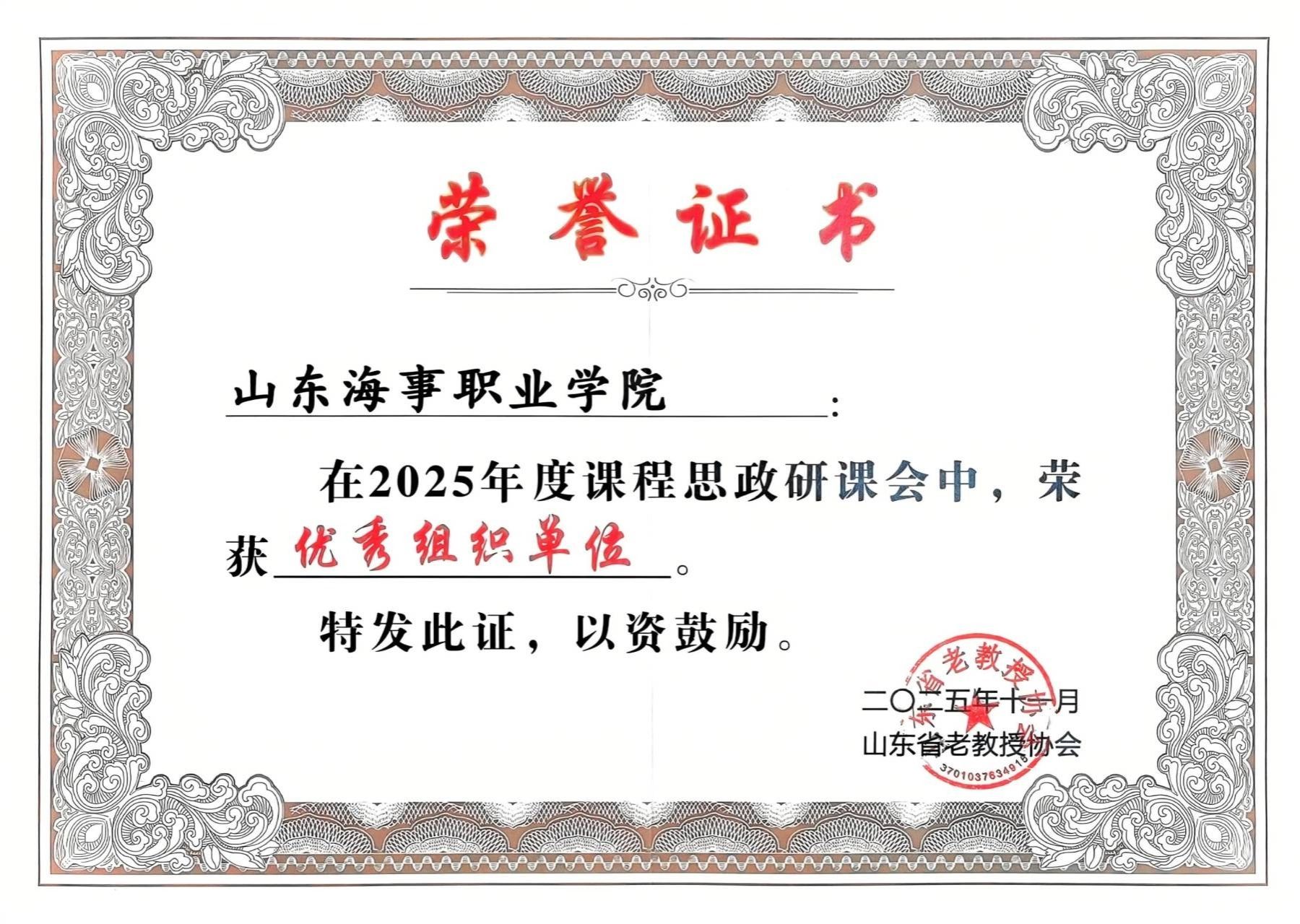 近日,2025年度山东省职业院校“课程思政研课总会”中,由我校航海学院杨静、潘琰、李婷婷、纪政辉四位教师与基础教学部葛晓彤老师组成的教学团队表现优异,荣获省级一等奖;学校因组织工作扎实、课程思政建设成效显著,被评为“优秀组织单位”。