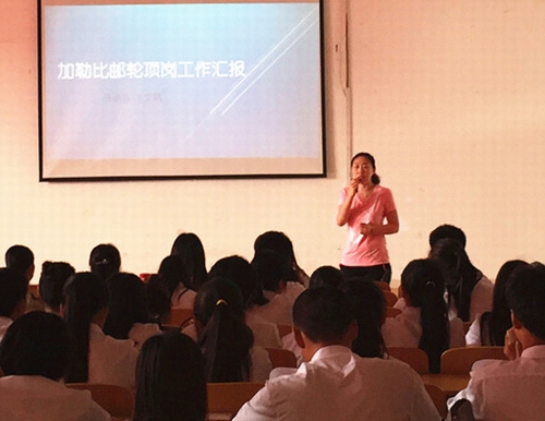 外语系主任金丽教授在会上做总结讲话。金教授指出,国际邮轮乘务专业建设、师资队伍建设取得的成果,离不开学院在教师培训、实训基地建设、学生就业的对接等方面创造的良好环境;外语系教师此次邮轮顶岗历练工作的成功实施,为国际邮轮乘务专业的师资培养打通了另一条渠道。金教授勉励同学们要认真按照学院的安排完成教学大纲所规定课程,练好基本功,争取有更多的同学加盟世界一流邮轮公司,为国际邮轮业的发展做出积极的贡献,为学院争光。同时,金教授阐发了“高职教育的根本目标是面向生产、建设、管理与服务一线培养高素质技术技能人才。只有教师沉下去,学生才能走出去”的教育理念。