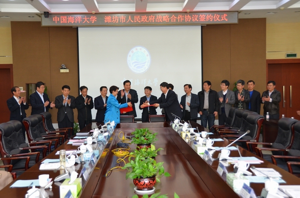 4月23日,潍坊市政府与中国海洋大学签署市校战略合作协议,充分发挥双方在海洋经济发展中的各自优势,积极开展产业规划、科学研究、人才培养、成果转化、产学研一体等领域的合作,携手建立市校合作发展新模式。市委书记杜昌文、中国海洋大学党委书记孙也刚出席签约仪式并致辞,副市长王桂英与中国海洋大学副校长李巍然代表双方签约;市委常委、秘书长孙明亮,中国海洋大学党委常务副书记张静、山东海事职业学院院长王敬良等出席仪式。