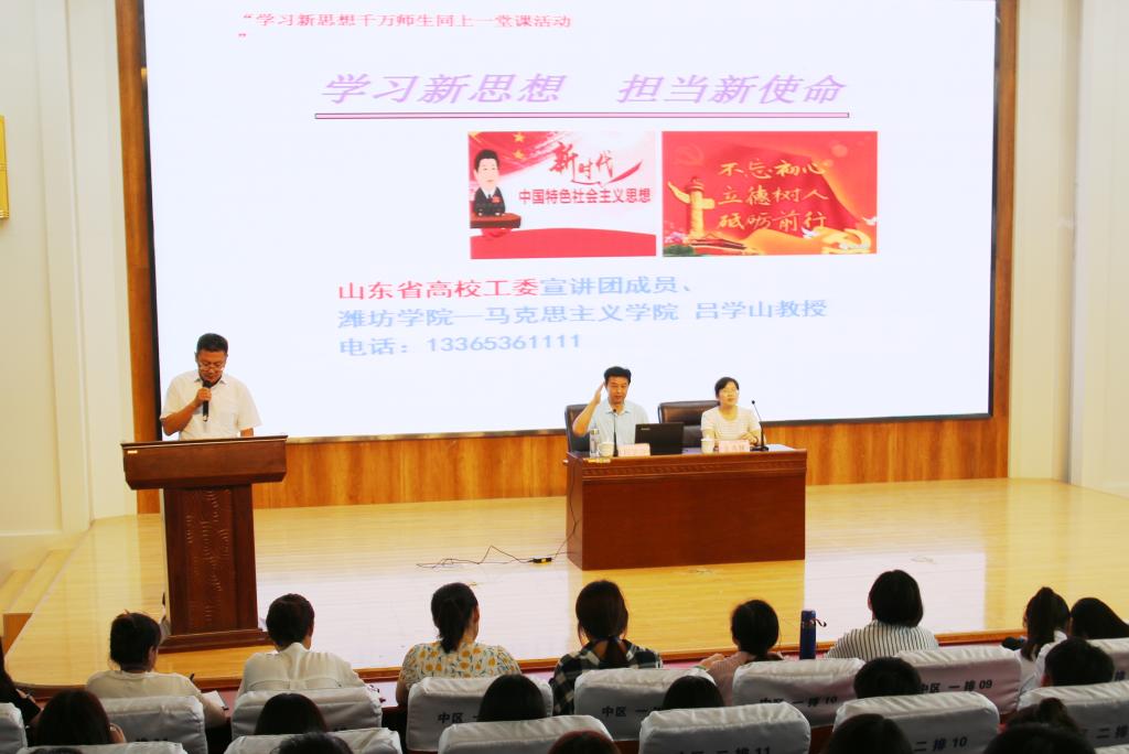 主讲嘉宾、山东省高校工委、山东省社科联党的十九大精神宣讲团成员、潍坊学院、马克思主义学院“形势与政策”教研室主任吕学山教授,以《学习新思想,担当新使命》为题,从“一个根本任务”“两个标准”“三项基础性工作”和“四点希望”对习近平总书记在北京大学师生座谈会的讲话内容作了阐述,从“三个一生”、“四个理论”、“三个飞跃”、“九个思想”解读了习近平总书记在纪念马克思诞辰200周年大会上的重要讲话精神,还重点就党的十九大的主题、习近平新时代中国特色社会主义思想、党的十八大以来近五年的历史性成就、中国特色社会主义进入新时代、我国社会主要矛盾的转化、习近平新时代中国特色社会主义思想现代化建设新征程的战略安排、今后工作的新部署、全面从严治党的顶层设计与战略部署等八个方面进行了全面、准确的解读。