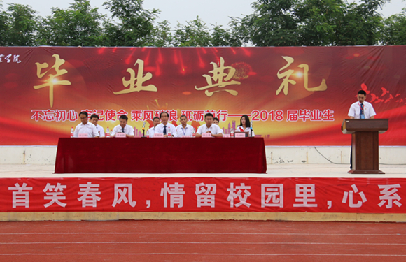 王院长在典礼上致辞赠言全体毕业生,他赞肯2018届同学是一届优秀的毕业生群体。王院长指出这一届毕业生一同见证了学院改革创新快速发展的三年,三年来学院获得的荣誉和品牌赞誉闪耀着同学们挣来的光彩!他代表全院师生员工祝贺毕业生们学业有成,感谢他们为学校的发展所付出的努力和奉献,也感谢各位家长对学校的关注和支持。王院长还特别指出,作为“学习标兵”的张肖涵同学在今年的上合青岛峰会中脱颖而出,峰会期间全程参与国家主席习近平及18位外国元首用餐主餐厅的服务,是全省64家星级酒店选拔90多名服务熟手中唯一一名在校大学生;“考研标兵”肖聪、闫杰、孟子恒,“创业标兵”王善舒、徐龙钦,闻名全校的省级、国家级“大赛标兵”王雯雯、孙欣以及125名同学组成的“专升本”群体等等,他们都是2018届的杰出代表。