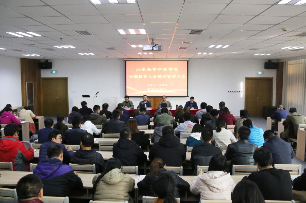 11月7日,山东海事职业学院召开全国教育大会精神宣讲大会,学院党委书记、院长王敬良全国教育大会精神进行传达宣讲,结合学院工作实际列出学院层面问题清单,就深入学习贯彻全国教育大会精神进行全面部署学院党委副书记徐立清,副院长李振鹏、仉继航,全体教研部主任、行政科室科长及中层以上干部参加了大会。