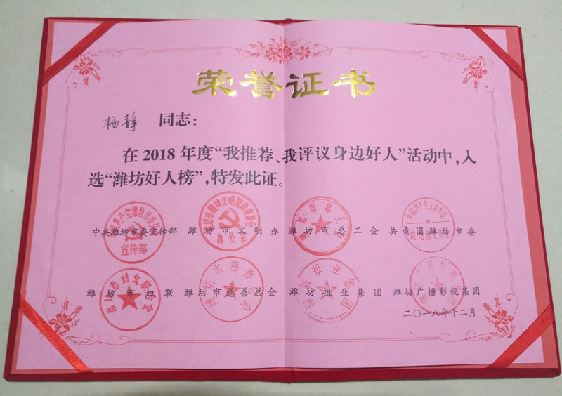 近日,潍坊市2018年“我推荐、我评议身边好人”评选活动公布“潍坊好人榜”入选人员名单,学院青年教师杨静以其对教育教学事业的热爱和奉献被评为2018年度“潍坊好人”。