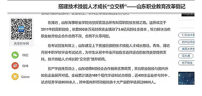 5月27日,新华社以“搭建技术技能人才成长‘立交桥’——山东职业教育改革侧记”为题,介绍山东海事职业学院探索混合所有制办学,推动产教深度融合的经验做法。