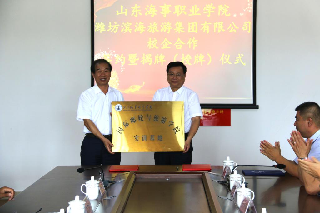 最后,山东海事职业学院党委书记、校长王敬良为潍坊滨海旅游集团有限公司授“国际邮轮与旅游学院实训基地”牌匾。
