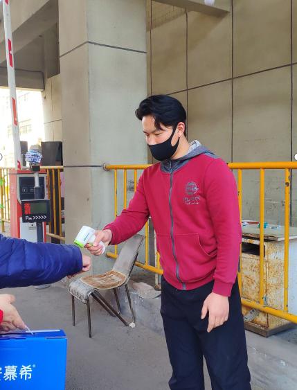 刘立志同学在坊子区华丽世家小区值班点为进出人员测量体温