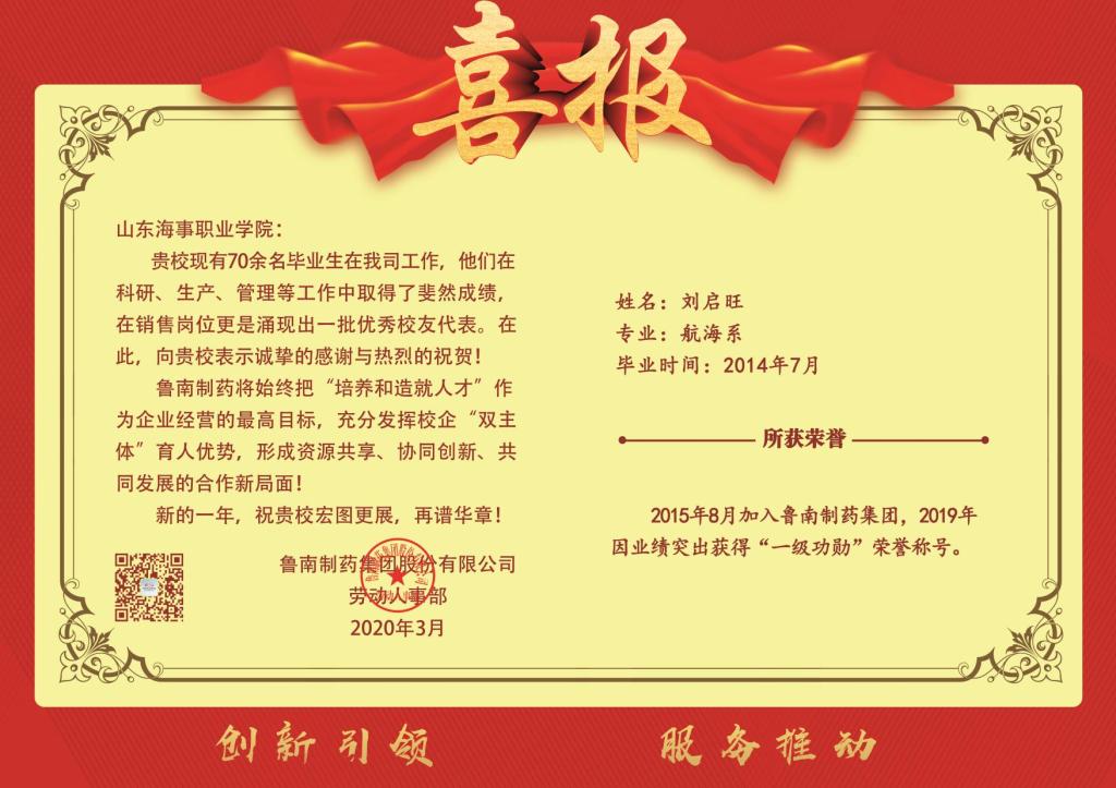 日前,在2020年鲁南制药集团股份有限公司总结表彰会上,我校多名毕业生受到表彰奖励。其中,学校2014届航海学院毕业生刘启旺业绩突出,获得“一级功勋”荣誉称号;学校2017届港航管理学院毕业生常斌、2018届港航管理学院毕业生魏鹏飞获得“标兵个人”荣誉称号;学校2016届机电与信息工程学院毕业生宋炳元、2018届航海学院毕业生王雍锋获得“先进个人”荣誉称号。并分别获得5万-10万元的奖金。