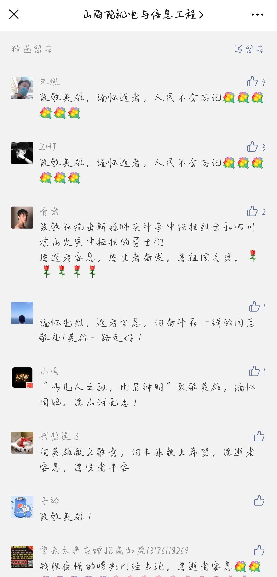 此次线上祭英烈活动以及组织全校师生参与全国性哀悼活动,激起了同学们心底之于民族大爱的震撼与感动!激起了同学们的爱国热情,许多同学饱含热泪,怀揣一腔爱国热忱参与线上祭英烈活动,默哀全程,泪水浸湿眼眶,更润湿内心家国情怀。昔日有英豪捐躯报国,救子民于水深火热之中;今日仍有千万逆行者,牢记使命,砥砺前行。在此致敬所有忘我工作、全力以赴不负人民的英雄!