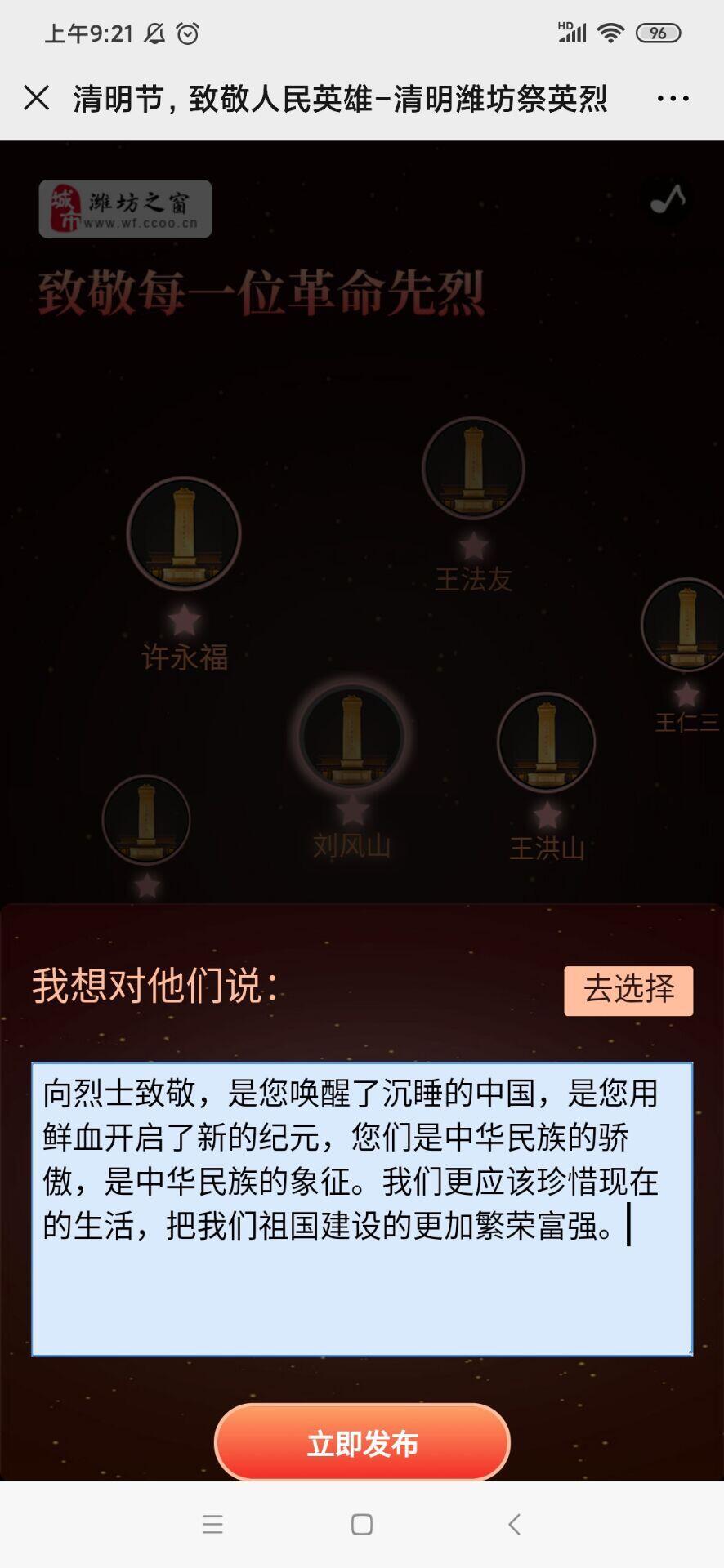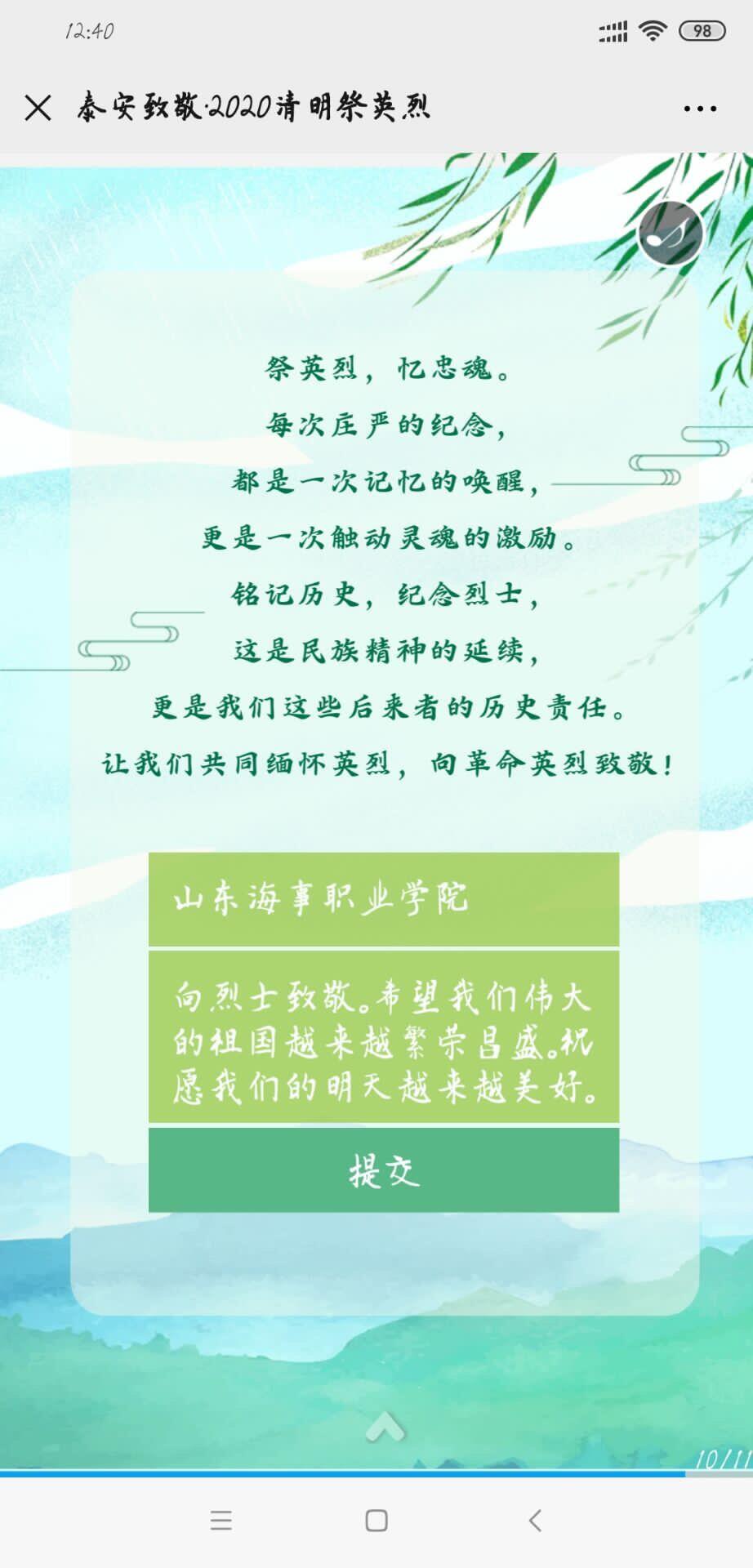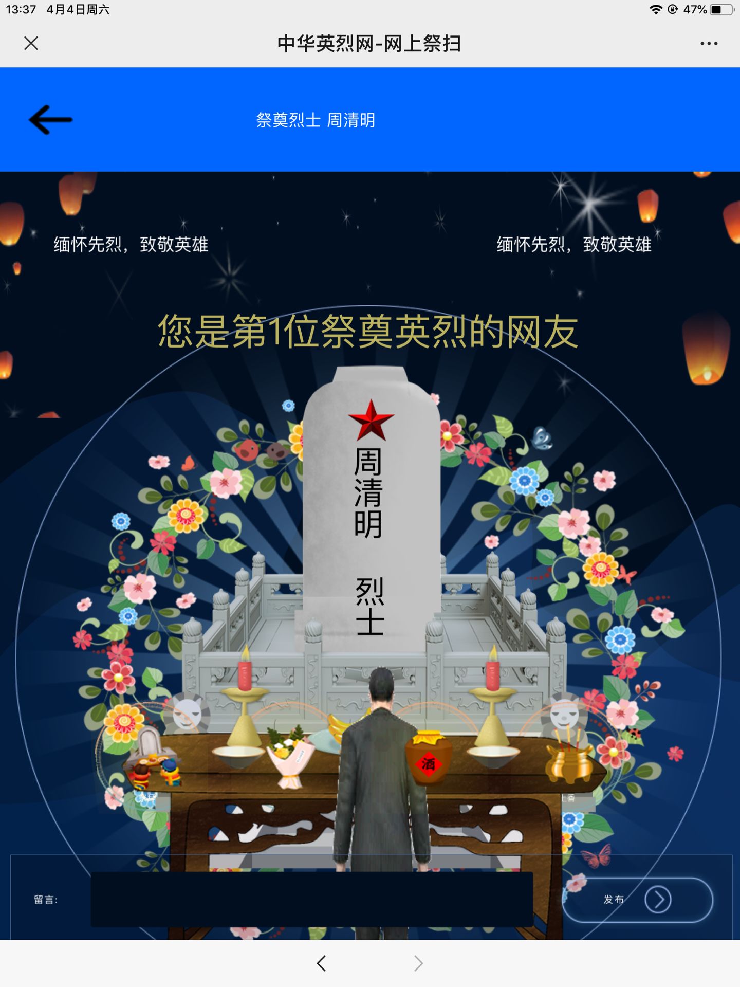 清明节是祭奠逝者、缅怀先烈的传统节日,为深入学习贯彻习近平总书记关于防控新冠肺炎疫情和英烈褒扬的重要指示精神,认真落实疫情防控各项措施,深入做好疫情防控期间英烈褒扬纪念工作,学校团委发出以“致敬--2020清明网上祭英烈”为主题号召广大同学参与网上祭扫活动。通过畅通网络平台,推行网上祭扫方式,积极营造崇尚英烈、学习英烈的浓厚氛围,倡议同学们在非常时期,通过网上祭奠英烈,向先贤先烈鞠躬献花,抒写感言寄语。