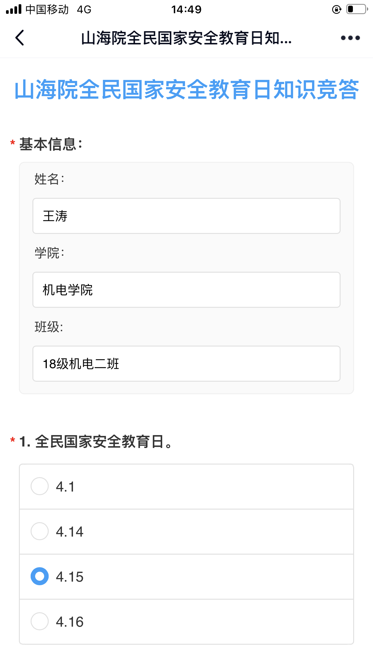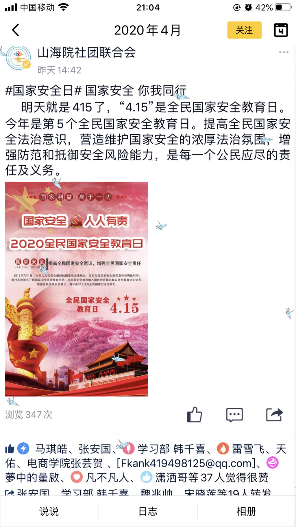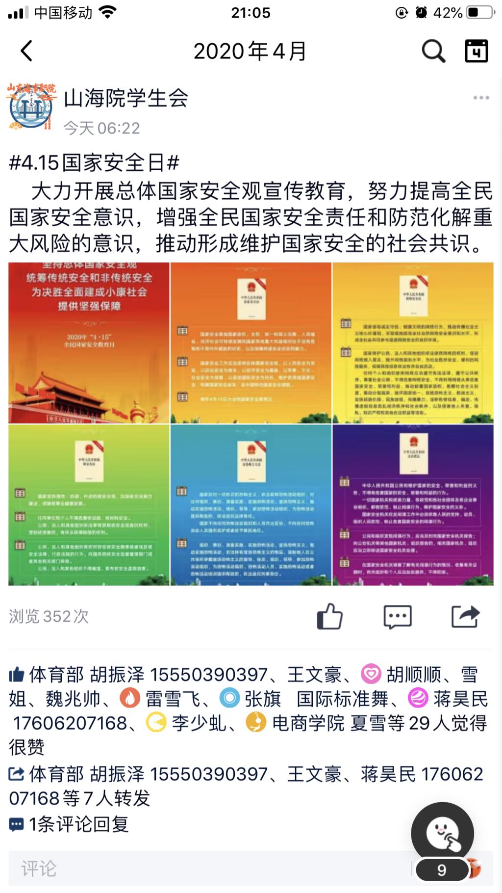 今年全民安全教育日,学校举办了一系列线上教育活动,其中包括知识竞答、主题班会、新媒体推送、钉钉软件学习等多种形式多样的线上教育活动,为师生了解国家安全法律知识提供多样化学习平台和学习机会。此次开展国家安全主题线上知识竞答,参与答题总人数共计2237人,平均分为77.43分,满分的同学占答题总人数的13%,90分以上同学占答题总人数的30%;辅导员结合当前疫情,线上召开关于国家安全的主题班会,通过班会讨论等交流方式深化探讨国家安全等话题,提升师生对国家安全重要性的认识;通过我校多种新媒体平台向全体师生推送国家安全主题知识;各班级辅导员老师组织学生通过钉钉群,观看关于国家安全的视频或者电影。丰富多样的活动形式,使学生们了解到更多国家安全现状,提高了自身的危机意识,从而进一步培养了爱国主义情怀,帮助学生逐步领悟国家安全需要共同维护的意义。
