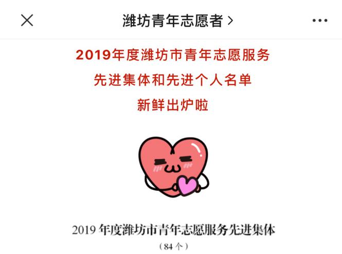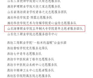 2020年4月,潍坊市共青团、潍坊市文明办、潍坊市志愿者协会联合开展了2019年度全市青年志愿服务先进集体和先进个人评选表扬活动。五年制大专学院青年志愿者服务团队在此次评选中荣获“2019年度潍坊市青年志愿者服务先进集体”荣誉称号。