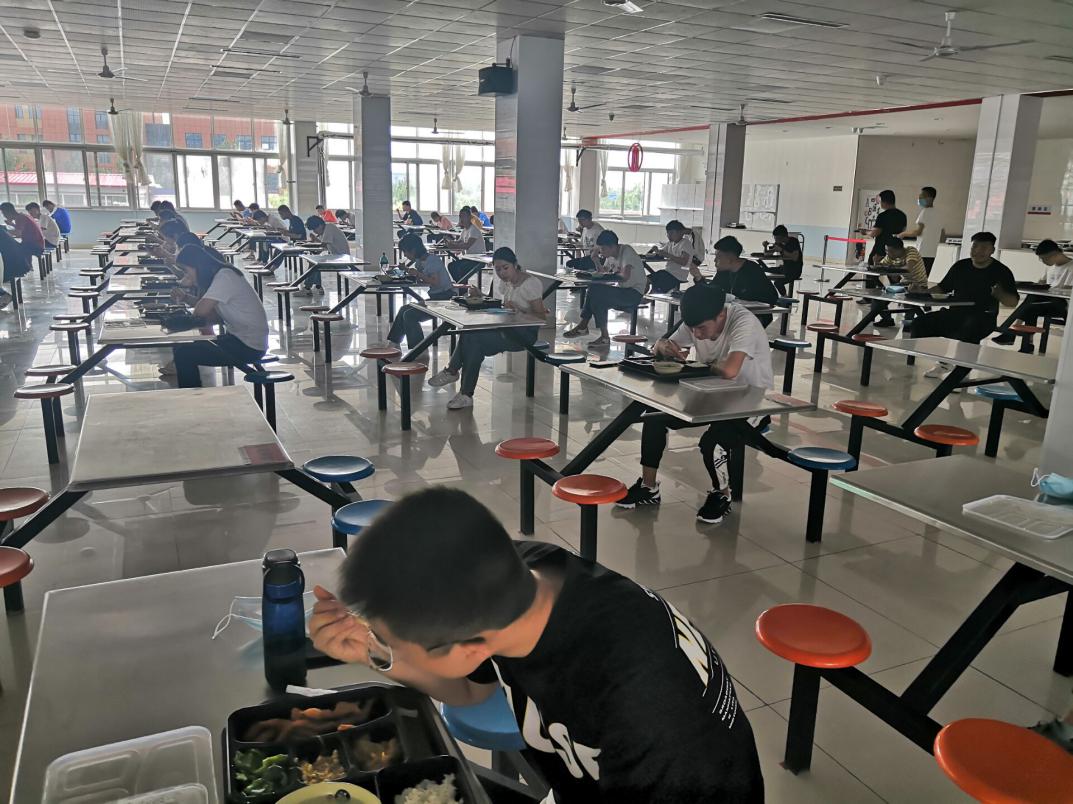 为引导学生养成按照指定进、出口单线同行路线进出1号教学楼习惯,机电学院制定教学楼出、入口“学生志愿者+辅导员+带班领导”的三级引导值班制度。由1名领导带班,2名辅导员、6名学生志愿者值班,时刻提醒学生佩戴口罩,引导学生按照指定路线有序进出教学楼及餐厅排队领餐,单人单桌就餐。
