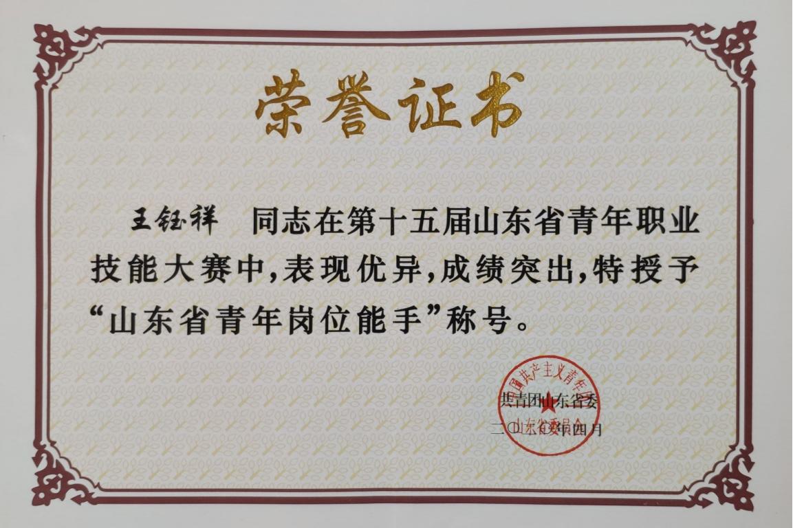 王钰祥同学荣获第十五届山东省青年职业技能大赛“山东省青年岗位能手”称号