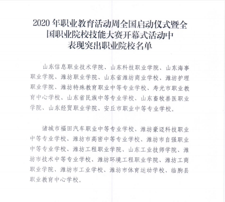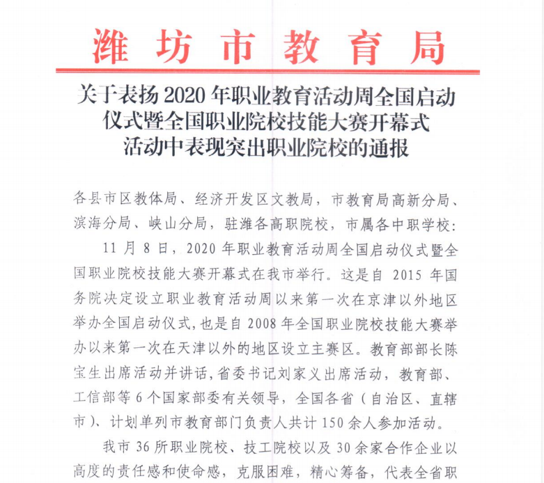 近日,潍坊市教育局印发《关于表扬2020年职业教育活动周全国启动仪式暨全国职业院校技能大赛开幕式活动中表现突出职业院校的通报》,对山东海事职业学院等24所在职教周活动中表现突出的职业院校进行了通报表扬。