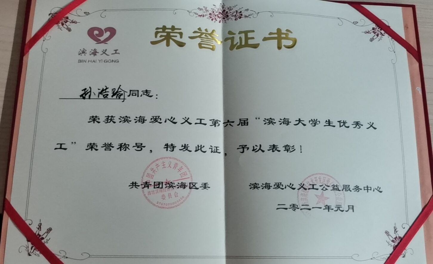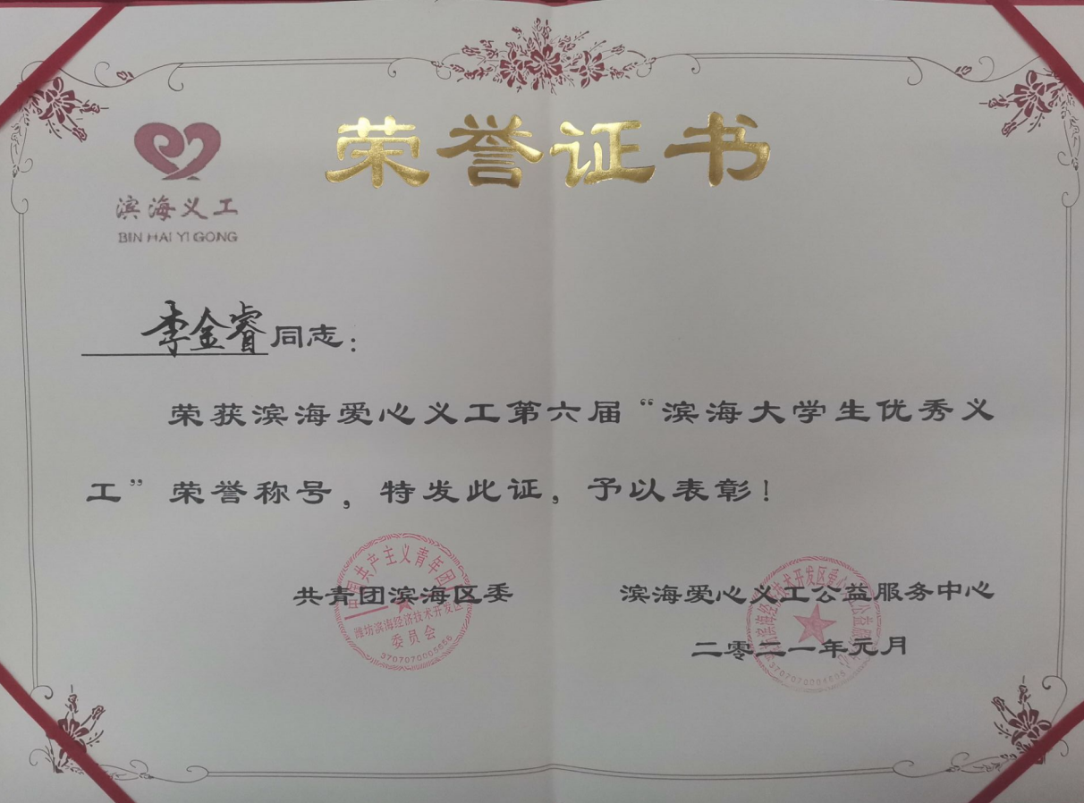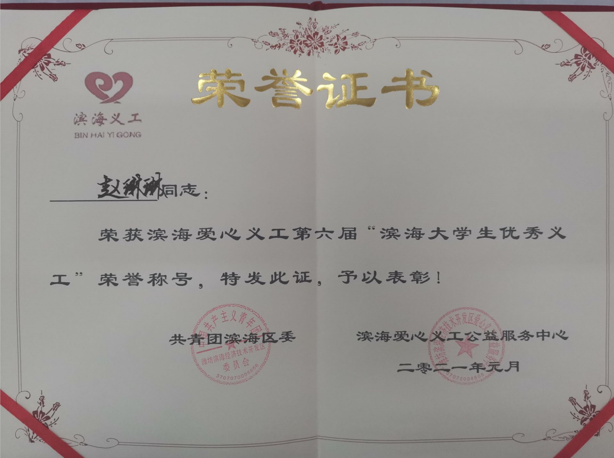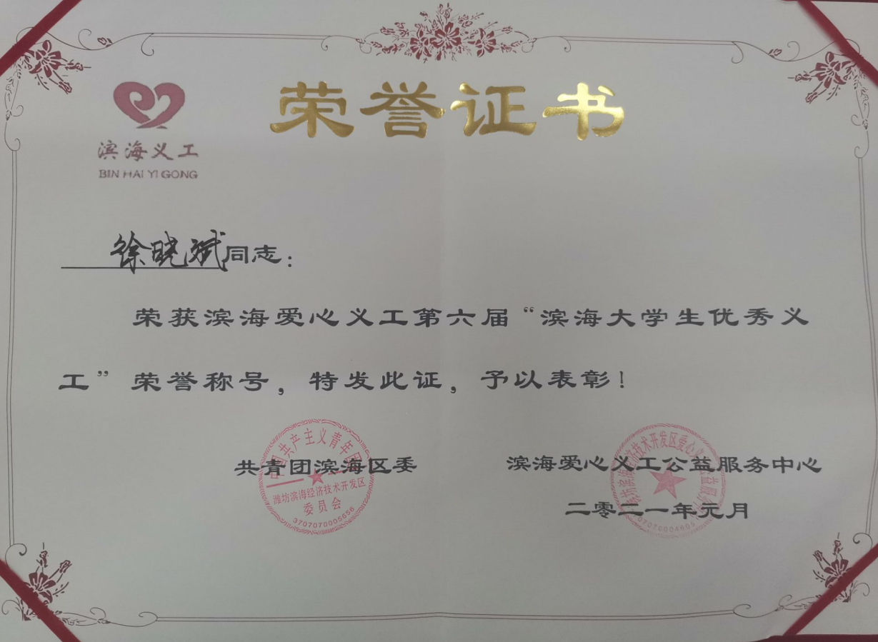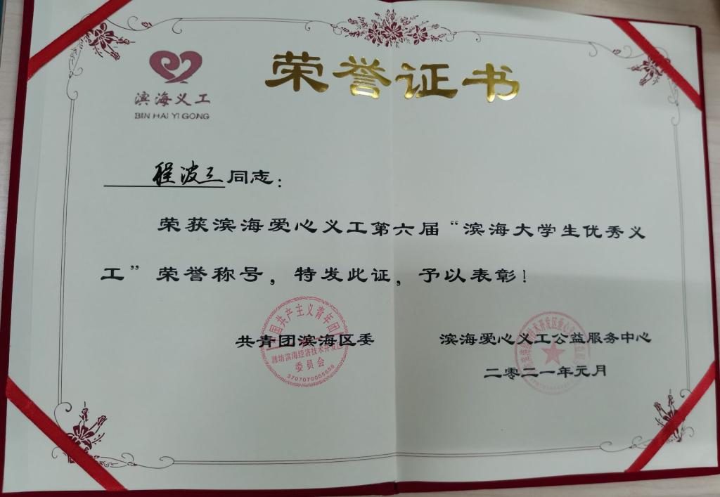 疫情期间,滨海区涌现出了一批积极参与志愿服务,积极投身公益活动,积极践行志愿精神的尚善义工家人。在场的领导为滨海十佳义工、滨海优秀义工、滨海爱心优秀大学生义工、滨海爱心公益优秀团体、滨海爱心公益企业颁发牌匾及证书。我校青志协被评为滨海爱心公益优秀团体,赵琳琳、徐晓斌、李金睿、程波三、孙浩瑜被评为“优秀大学生义工”。