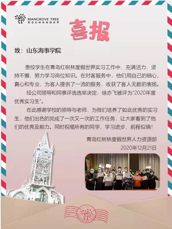 近日,航空学院收到了来自青岛的一封热情洋溢的表扬信,信中对目前正在青岛红树林度假世界实习的航空学院2018级徐亦飞等15名同学给予表扬。信中说:“贵校学生在实习工作中,充满活力,坚持不懈,努力学习岗位知识。在对客服务中,他们用自己的细心、真心和专业,为客人提供了一流的服务,收获了客人无数的表扬。”其中,徐亦飞同学还被评为”2020年度优秀实习生”。实习企业还特别对学校的领导、老师,同学们表示了感谢,感谢同学们“出色的完成了一次又一次的工作任务,让大家看到了他们的优秀及能力。”