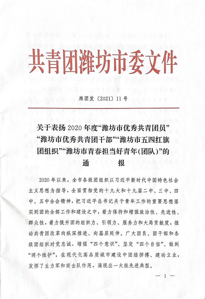 近期,团市委下发了《关于表扬2020年度“潍坊市优秀共青团员”“潍坊市优秀共青团干部”“潍坊市五四红旗团组织”“潍坊市青春担当好青年(团队)”的通报》,我校港航管理学院团总支获得“潍坊市五四红旗团组织”荣誉称号;第十届校学生会获得“青春担当好团队”荣誉称号;邮轮游艇学院团总支书记任明飞获得“潍坊市优秀共青团干部”荣誉称号;侯晓凡、周佳伟同学获得“潍坊市优秀共青团员”荣誉称号;刘颜衡同学获得“潍坊市青春担当好青年”荣誉称号。