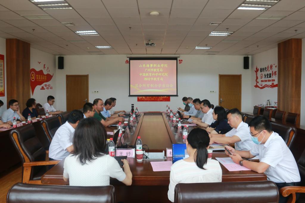 7月14日下午,广州市教育局党组成员、副局长谷忠鹏一行五人,中国教科院职业与继续教育研究所副研究员王纾一行四人,在潍坊市教育局副局长韩光福等人陪同下,来我校交流混合所有制办学。校长王敬良、副校长宋志刚及研究室主任郭素森、电商学院、航空高铁实训中心、国际海洋工程培训中心相关负责人参加座谈。