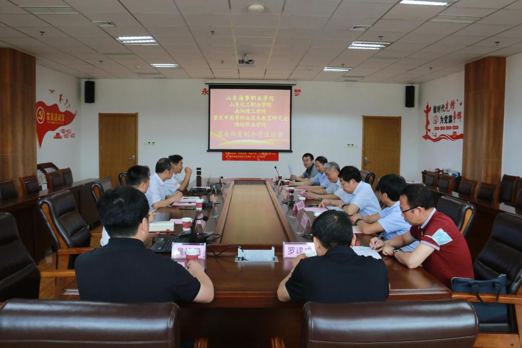 7月19日上午,南阳理工学院副校长肖泽昌一行六人,重庆市高等职业技术教育研究会会长张亚杭,潍坊职业学院副院长李瑞昌、潍坊职业学院发展规划处处长李寿冰,来我校调研混合所有制办学经验和产业学院建设情况。副校长张庆会、吕明及研究室主任郭素森参加座谈。