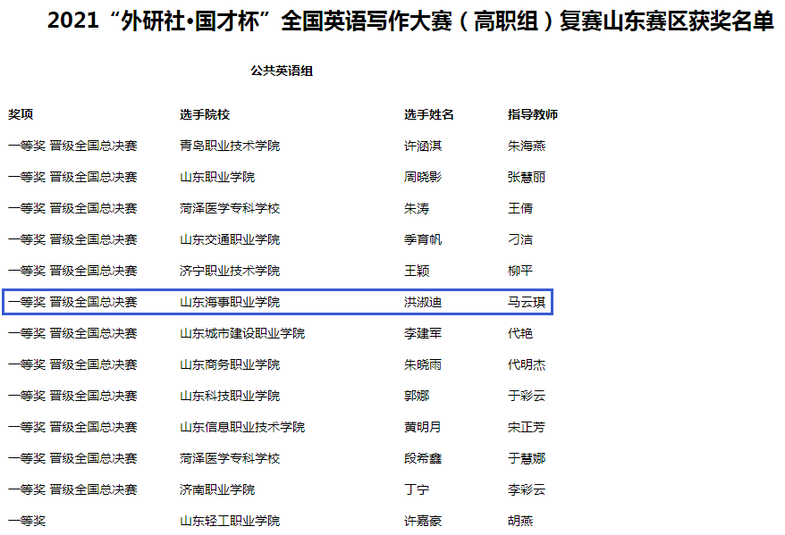 近日,在由山东省教育厅高等教育处指导的2021“外研社·国才杯”全国英语写作大赛(高职组)山东赛区复赛中,我校基础部教师马云琪指导的21级大数据与会计专业洪淑迪荣获一等奖,并成功晋级全国总决赛。