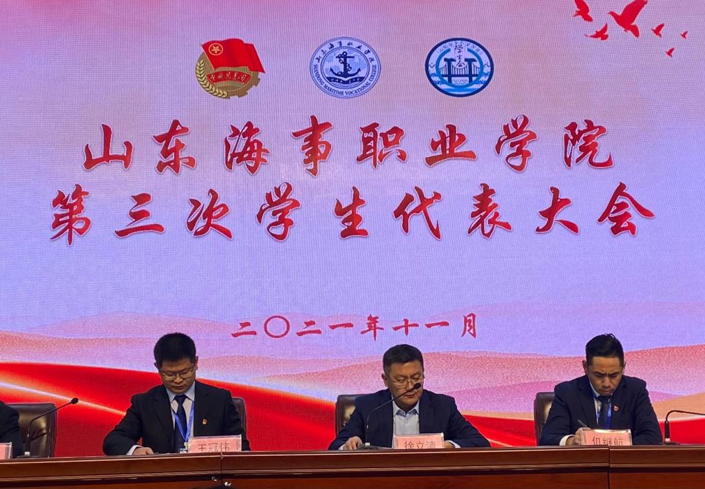 11月27日,山东海事职业学院第三次学生代表大会在我校图书馆报告厅召开。学校党委副书记、执行校长徐立清、副校长仉继航、学生处副处长王冠伟、团委副书记郑晓龙、各二级学院团总支负责同志、团委工作人员和125名正式学生代表参加会议。