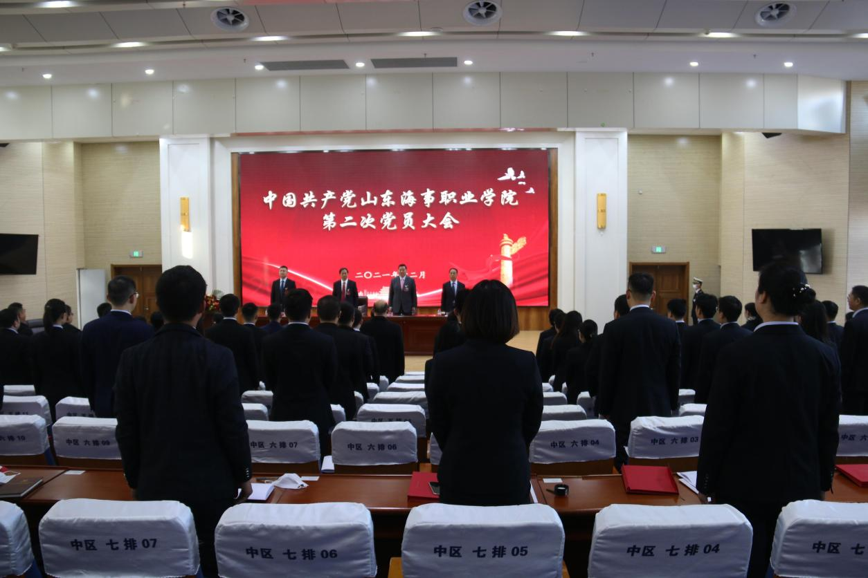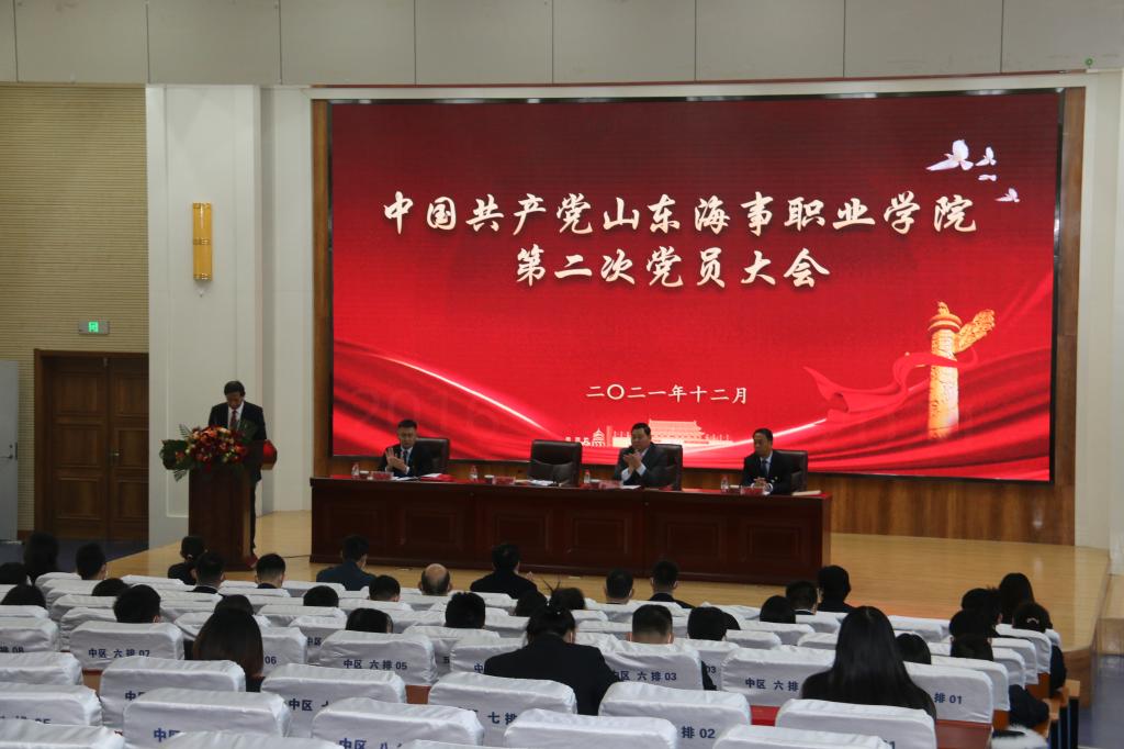 大会在激昂雄壮的国歌声中拉开帷幕。党委常务副书记孔祥奴宣读《中共潍坊市委教育工作委员会关于同意中共山东海事职业学院委员会召开党员大会举行换届选举的批复》。党委副书记、执行校长徐立清代表中共山东海事职业学院第一届委员会作了题为《聚焦新使命 奋力开启高质量发展新征程》的报告。报告全面回顾和总结了学校第一次党员大会以来党的建设和各项事业改革发展取得的成就,分析了当前学校发展面临的问题和机遇,阐述了未来学校发展的战略目标、工作任务和重点举措。报告强调,全体党员干部要从非凡的百年党史中汲取智慧和精神力量,不忘为党育人、为国育才的初心使命,以永不懈怠的精神状态和一往无前的奋斗姿态,团结带领广大师生用实干推动学校高质量发展再上新台阶。会上,王德帅同志代表中共山东海事职业学院第一届纪律检查委员会作题为《打造风清气正的干事创业氛围 为学校“十四五”高质量发展提供纪律保障》的工作报告。王敬同志代表中共山东海事职业学院第一届委员会作《关于党费收缴、使用和管理情况》工作报告。