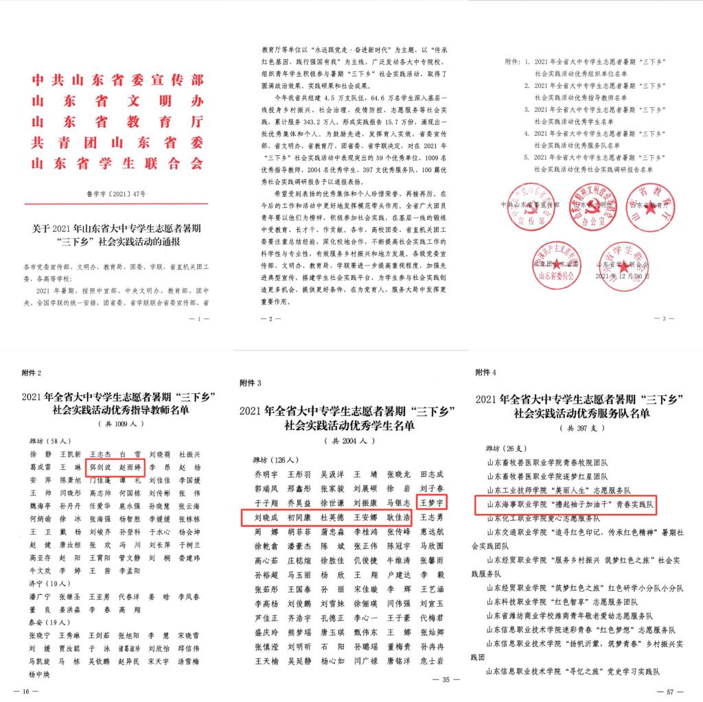 近日,中共山东省委宣传部、山东省文明办、山东省教育厅、共青团山东省委、山东省学生联合会联合下发文件,对2021年山东省大中专学生志愿者暑期“三下乡”社会实践活动中的先进集体和先进个人进行表彰。我校教师弭剑波、赵雨婷被评为“省级优秀指导教师”;“撸起袖子加油干”青春实践队被评为“省级优秀服务队”;王梦宇、刘晓成、初同康、杜英德、王安娜、耿佳浩6名学生被评为“省级优秀学生”。