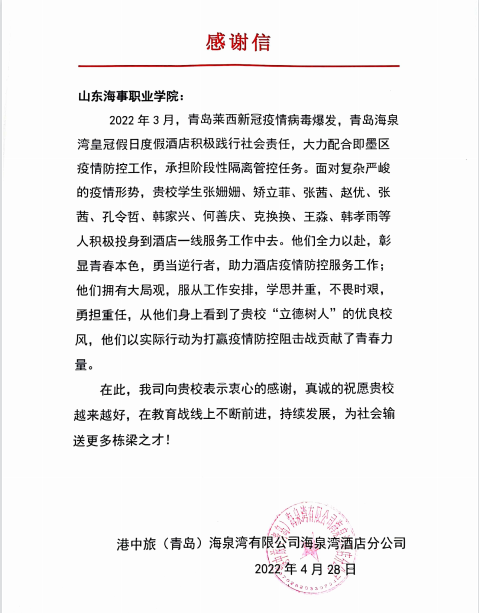 日前,我校收到来自青岛海泉湾皇冠假日度假酒店的感谢信。信中对我校2019级、2020级国际邮轮乘务管理专业学生张姗姗、矫立菲、张茜、赵优、张茜、孔令哲、韩家兴、何善庆、克换换、王淼、韩孝雨等同学在青岛莱西疫情防控工作中的突出表现给予充分肯定。