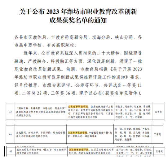 近日,潍坊市教育局公布了2023年潍坊市职业教育改革创新成果获奖名单。我校陈铭志老师主持的《“混制互融、共建共管、市场运行、利益共享”高职院校混合所有制公共实训基地建设运营模 式研究与实践》获二等奖,张娣老师主持的《三元协同、四双并举、多径评价:邮轮运营服务人才培养模式的创新与实践》、孟祥云老师主持的《高职院校电子商务专业“翼双飞”项目化教学模式改革研究与实践》获三等奖。