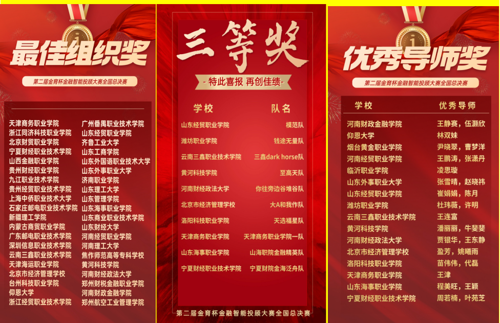 近日,由《当代金融家》杂志社主办、金智东博(北京)教育科技股份有限公司承办的2023年第二届“金育杯”金融智能投顾大赛全国总决赛落下帷幕。港航管理学院参赛团队“山海职院金融精英队”(队员:庄紫涵、钟华宏、尹玉丽、张誉腾,指导老师:程美旺、王颖)获得竞赛团队三等奖;指导老师程美旺、王颖老师获得“优秀指导老师奖”;我校被授予“最佳组织奖”。