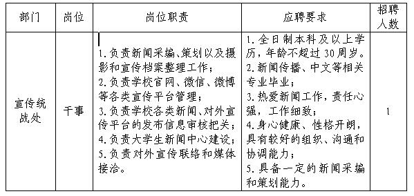 根据工作需要,我校拟对外公开招聘宣传统战处干事1名,现将有关事项公告如下: