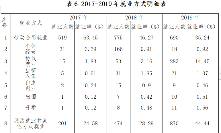 学校毕业生就业方式呈现多元化趋势,主要以劳动合同就业率为主,灵活就业和其他方式其次,个体经营、协议就业、应征入伍、自主创业、出国、升学等多种就业方式。近三年各个就业方式的就业人数和就业率如下表: