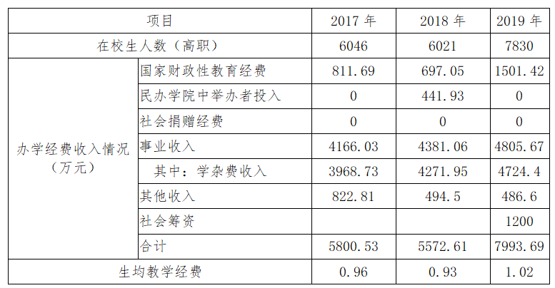 作为一所混合制民办高职院校,学院的主要经费来源于学费和培训收入,为保障正常运转,在争取国家财政经费补助的同时,学校多方筹措资金,通过校企合作、社会融资等渠道解决经费短缺的问题。近三年,生均财政拨款水平分别为0.13万元、0.12万元、0.19万元,经过我校多方筹措,年生均教育经费水平保持在0.9万元以上,2017、2018、2019年学院年生均教育经费水平分别为0.96万元、0.93万元、1.02万元,能够满足教育教学顺利开展。