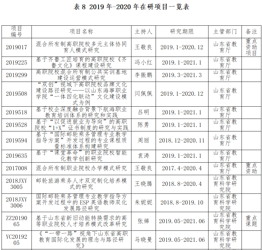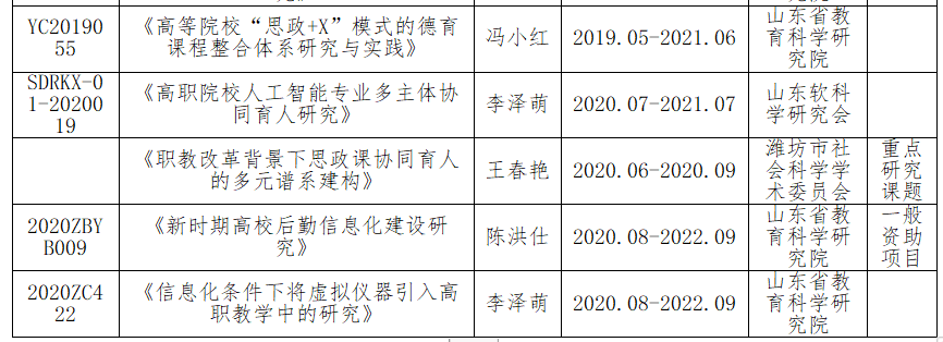 学校强化科研项目管理,提升教育科研质量。教育科研是学院工作的重要组成部分,教育科研的重点是课堂改革。学校紧紧围绕提升内涵建设,结合学院混合制办学特色及区域经济发展实际,积极开展课题研究。其中冯小红老师主持的《高职院校齐鲁文化“一导二研三元八融”策略的创新与实践》课题获2019年度山东省高等学校人文社会科学优秀成果奖高职高专院校类叁等奖。2020年7月,李泽萌老师申报的《高职院校人工智能专业多主体协同育人研究》获批2020年度山东软科学研究会“产教融合研究智库专项”课题。2020年8月17日,山东省教育科学研究院公布了《山东省教育科学“十三五”规划2020年度课题立项评审结果公示》,学院共有2项课题获准立项,其中1项为一般资助课题。我院2019.09-2020.08立项、在研的教育科研项目汇总如下。