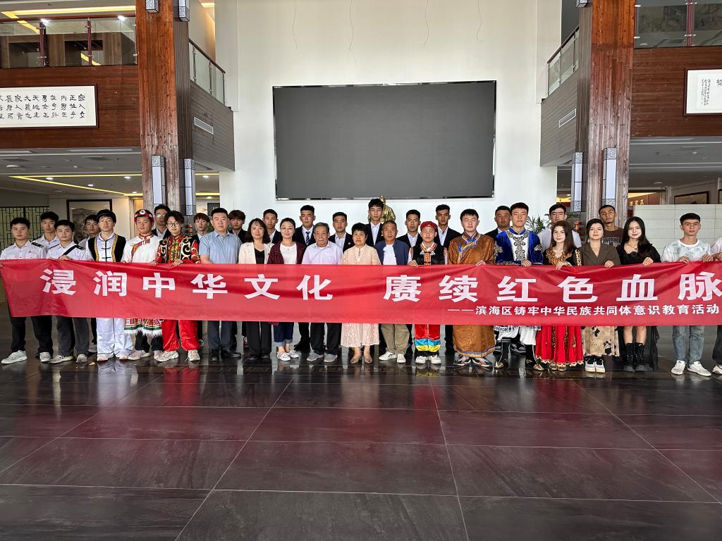 师生代表在滨海区海潮音创意文化产业园感受甲骨文、古汉字以及中华家训等中华传统文化的魅力;在渤海走廊滨海革命展陈馆实地了解抗日战争时期的滨海英雄人物及事迹;参观革命先烈朱剑秋烈士故居原址,缅怀革命先烈,厚植爱国情怀。在交流会上,同学们积极发言,分享彼此的文化习俗和生活故事,感受着不同民族文化魅力,最后,他们纷纷表示将努力学好文化知识,积极投身服务社会,为实现中华民族伟大复兴的中国梦贡献青春力量。
