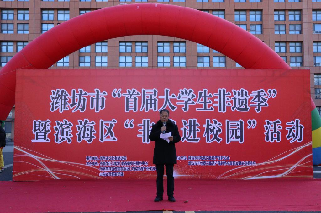 11月27日,由潍坊市文化和旅游局指导,齐鲁文化(潍坊)生态保护区服务中心、潍坊市非物质文化遗产保护协会、潍坊滨海区旅游度假区(文体旅游产业发展中心)、山东海事职业学院联合主办,潍坊市非物质文化遗产保护协会传统食品专业委员会承办的“潍坊市首届大学生非遗季暨滨海区‘非遗进校园’活动”在我校山海大道开幕。齐鲁文化(潍坊)生态保护区服务中心副主任赵永,学校党委委员、副校长宋志刚,滨海区旅游度假区(文体旅游产业发展中心)党委书记冯月玲,学校学生工作处主任齐万昌、教授赵培敬出席此次活动。