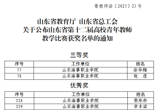 近日,山东省教育厅、山东省总工会印发《关于公布山东省第十二届高校青年教师教学比赛获奖名单的通知》(鲁教师函〔2025〕23 号),学校健康管理学院徐华梅、港航管理学院张滢老师获得三等奖,机电工程学院郭彤彤、基础教学部李丰梁老师获得优秀奖。