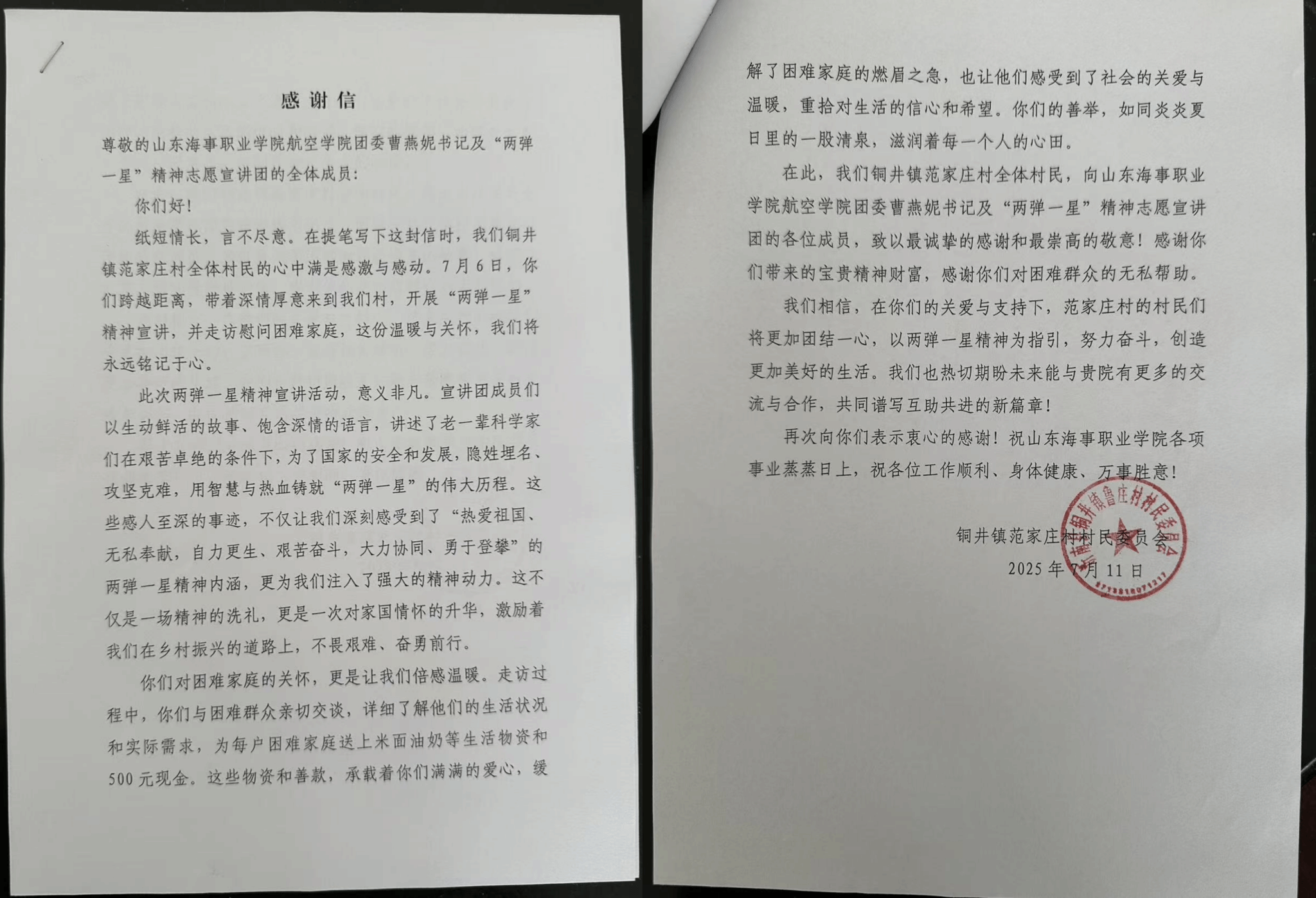 此次活动既是响应学校 “躬身力行、创新形式” 动员要求的践行,更以实际成效赢得铜井镇范家庄村村民委员会感谢信赞誉。航空学院将持续引导青年学子在服务乡村振兴中锤炼本领,以青春之声传递信仰力量。