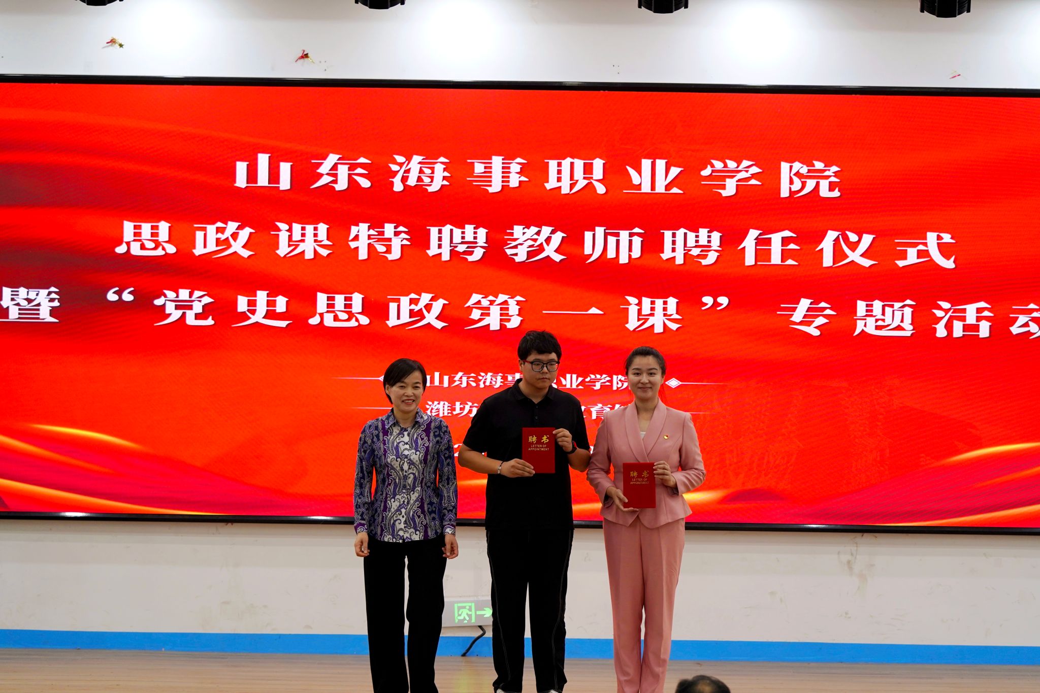 随后,冯小红同志向潍坊市党史教育馆专家代表王鑫、张浩磊颁发山东海事职业学院思政课特聘教师证书,本次共聘请15名专家担任我校思政课特聘教师,为持续打造“校内+校外、专职+兼职”的跨学科、跨领域的教师队伍注入力量。