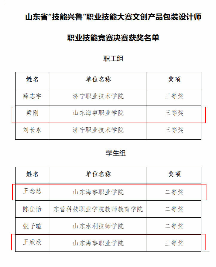 近日,山东省“技能兴鲁”职业技能大赛文化创意包装设计师赛项决赛圆满落幕。我校电商学院师生凭借过硬的专业素养获佳绩,梁刚老师荣获职工组三等奖,学生王念慈、王欣欣分获学生组二等奖、三等奖各1项。