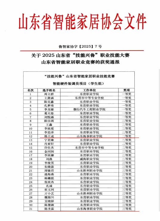 2025 年 12 月,山东省“技能兴鲁”职业技能大赛智能家居职业竞赛圆满落幕,我校物联网应用技术专业闫绍友老师荣获职工组二等奖,陈浩浩、杨晓朦老师荣获三等奖。由陈浩浩、杨晓朦老师指导的学生组获得二等奖一项、三等奖一项。